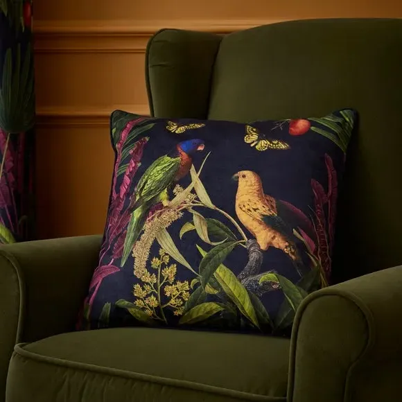 **In collaboration with the Natural History Museum*** Includes 2 x curtain panels* Crafted from a luxurious velour style fabric* 100% recycled polyester fabric and lining* Durable brushed steel eyelets* Available in a selection of multiple widths and drops* Coordinating cushion available Brighten up your home with the beautiful Tropical Treasures curtain range. Inspired by artwork held in the Natural History Museum archives, these curtains sport a striking maximalist print, featuring tropical birds among exotic foliage. Fully lined for extra support, these curtains are crafted from 100% recycled polyester with a rich velour finish for an added touch of luxury. Available in a range of widths and drops, you can create a cohesive look within your home.**Natural History Museum x Dunelm**Featuring a combination of colourful tropical birds and exquisitely detailed butterflies hidden amongst lush tropical palms, the Tropical Treasures collection has adopted some of the beautiful, historical artwork held within the Museum’s archives to create a warm and vibrant scene. A celebration of some of the more exotic species from tropical lands, this collection is perfect for creating a bold statement with a wild, summery feel.© The Trustees of the Natural History Museum, London 2024. All Rights Reserved.