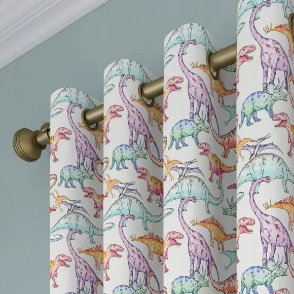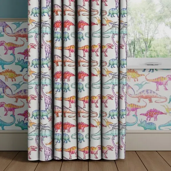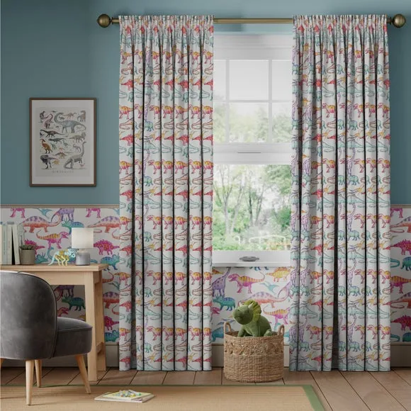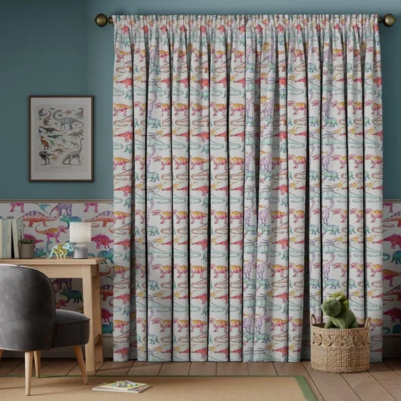In collaboration with the Natural History Museum* Soft and Breathable 100% Cotton composition* Vibrant Dinosaur design* Coordinating Made to Measure and Made to Order items available to purchase separately Ignite your child’s imagination with the Dinosaur Gallery Made-to-Measure Curtains, part of the Natural History Museum Collection. Made from 100% cotton, these vibrant curtains feature bold, colorful dinosaur illustrations, perfect for creating a playful and exciting space. Custom-made to your specifications, they are available with various headers and linings to ensure a flawless fit. Designed for durability and breathability, these curtains are the ideal finishing touch for a child’s bedroom or playroom. Natural History Museum x Dunelm Since the name ‘Dinosauria’ was first coined back in 1842 by the founder of the Natural History Museum, Sir Richard Owen, there has been a public fascination with these awe-inspiring creatures. And where better to learn more about these prehistoric beasts than at the Museum’s Dinosaur Gallery that houses the world’s most diverse collection of dinosaur fossils including the most complete Stegosaurus in the world and the jawbone of the first T. rex ever found. This collection celebrates dinosaurs from the different time periods spanning the Mesozoic Era, celebrating their enduring appeal to kids and adults alike.© The Trustees of the Natural History Museum, London 2025. All Rights Reserved. Please note: You measure for pinch pleat curtains in the same way as pencil pleat curtains.