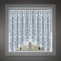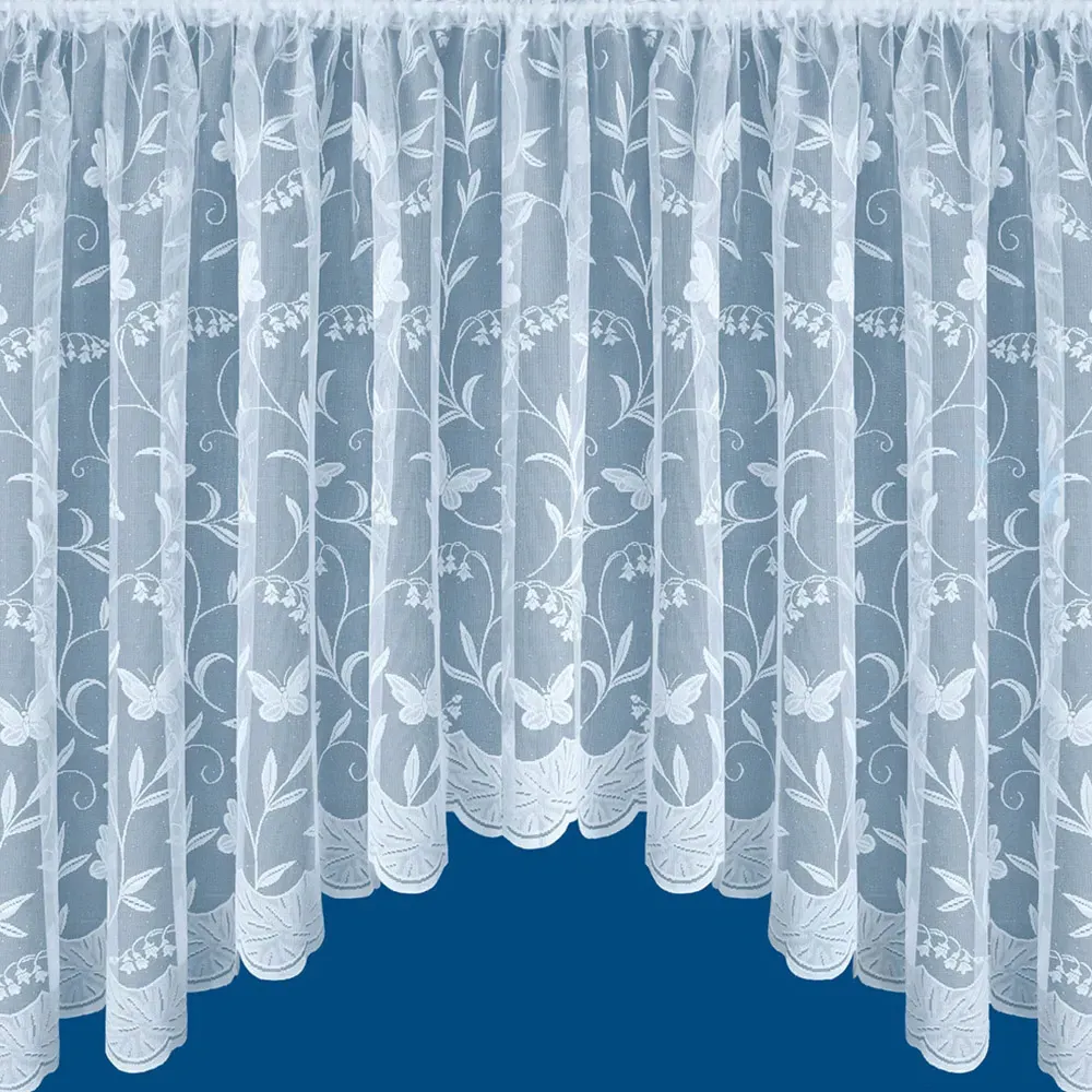 The Hawaii Jardiniere net curtain features a trailing leaf design with butterfly motifs, crafted from 100% polyester for a soft handle and beautiful drape. Its pocket header design suits net rods and wire systems, while the lightweight construction allows excellent light flow and air circulation. The net panel provides privacy at windows with its delicate pattern, and the polyester material ensures easy maintenance with machine washing at 30°C. W254 x H91 cm