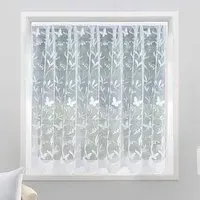 The Hawaii net curtain features a trailing leaf design with beautiful butterflies in 100% polyester construction. Its pocket header design suits net rods and wire systems, while the soft handle fabric drapes naturally. The net panel allows light flow and air circulation while providing window privacy. Machine washable at 30°C with cool iron care. W200 x H91 cm.