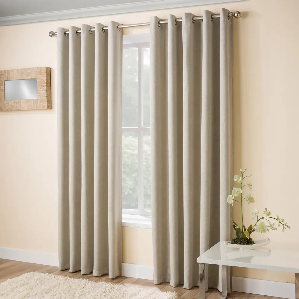 Enhance the ambience of your living space with the Enhanced Living Vogue Cream Thermal Blackout Eyelet Readymade Curtains 117 x 137cm. These curtains utilise advanced triple weave technology, which effectively blocks out light and reduces outdoor noise. Additionally, they demonstrate a decrease in energy loss of over 20%, contributing to thermal efficiency. The thermal properties of the curtains help keep your room cool in the summer and warm in the winter, ultimately reducing your energy bills. Featuring an eyelet header, these curtains are easy to hang on standard curtain rods (Rod not included). Each package contains a pair of curtains made from 100% polyester, requiring easy care. Hand wash only; do not bleach or tumble dry. A cool iron can be used on the reverse side if needed. Each silver eyelet ring has an inner diameter of 4 cm. Please measure carefully before purchasing.
