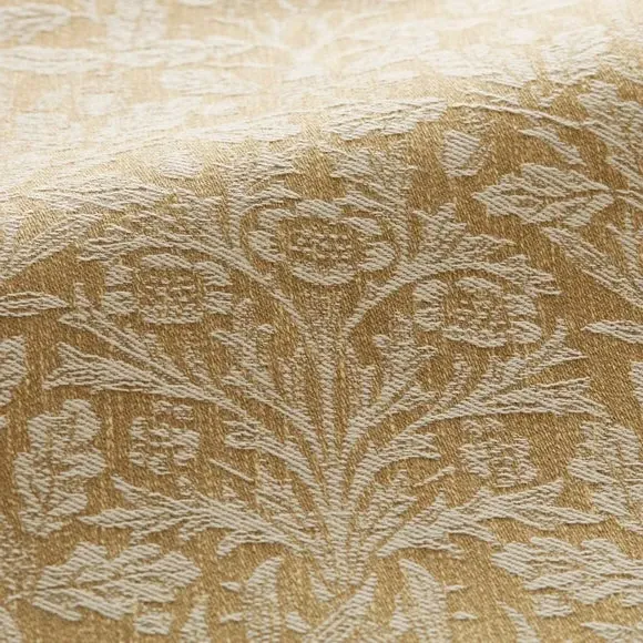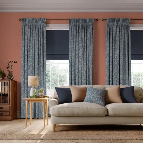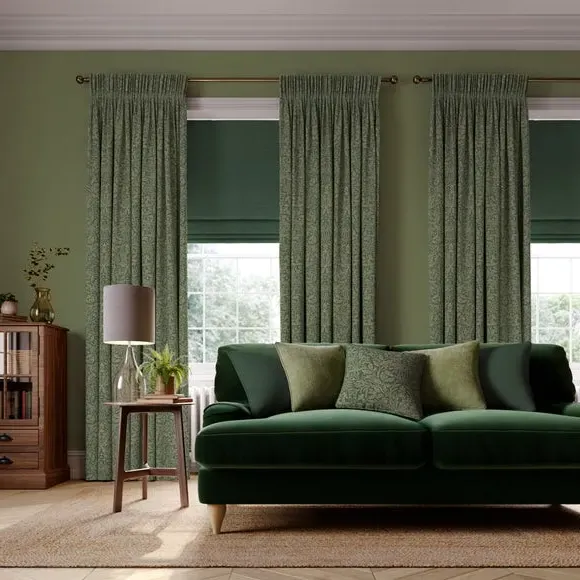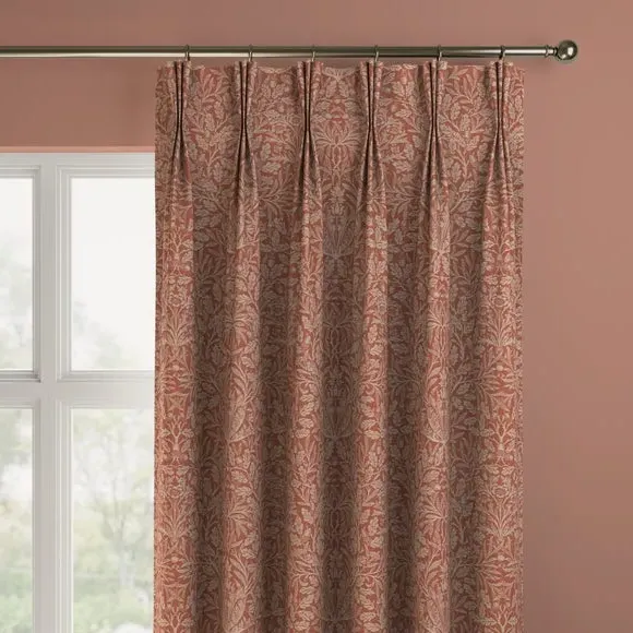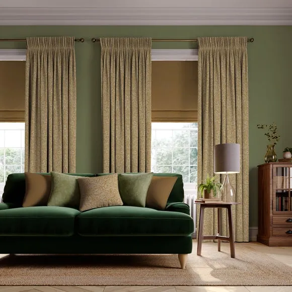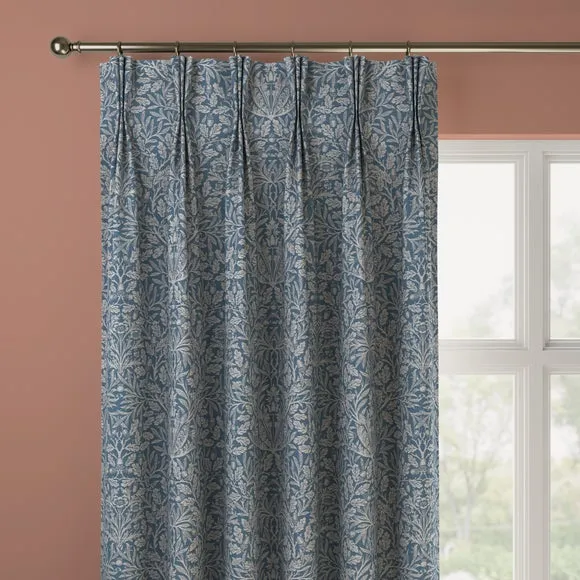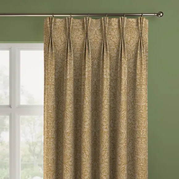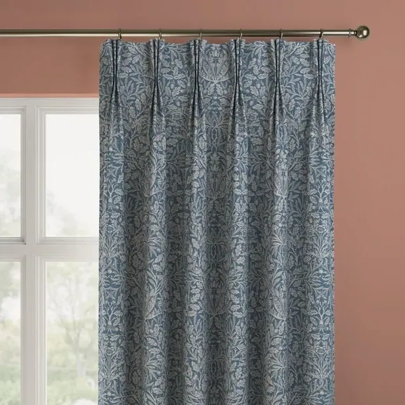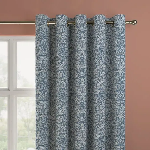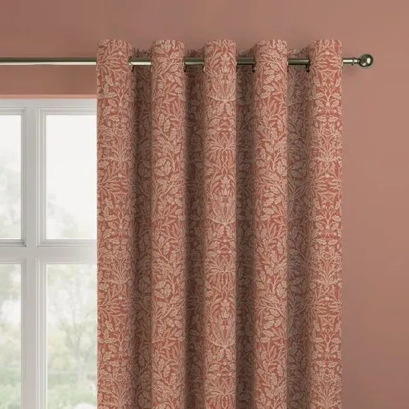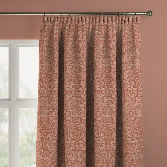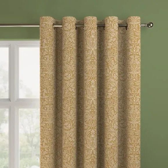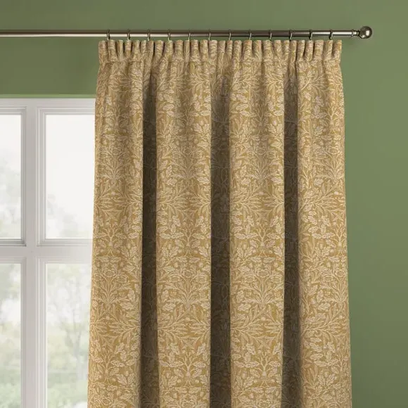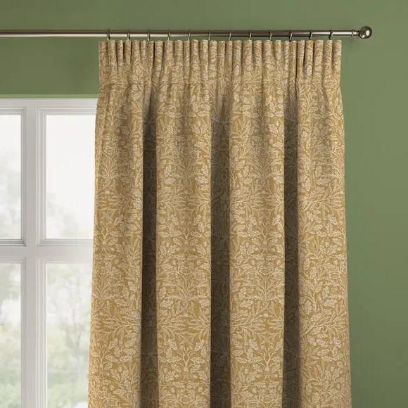 The curtains feature an intricate arts and crafts pattern of oak leaves, acorns, and delicate flowers with soft and durable polycotton composition. The historic design brings a nature-inspired aesthetic while the fabric ensures lasting durability. Available with a selection of header and lining options to suit various hanging preferences. For widths over 124cm, curtains include a fabric join to provide the full width required.