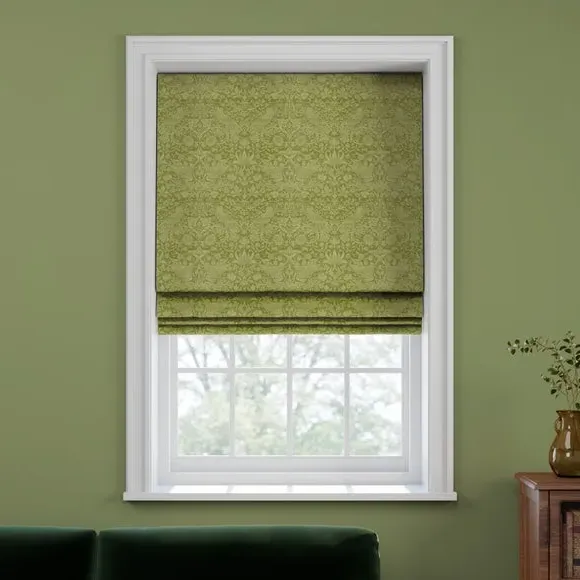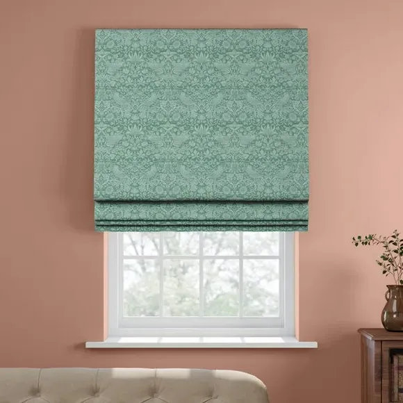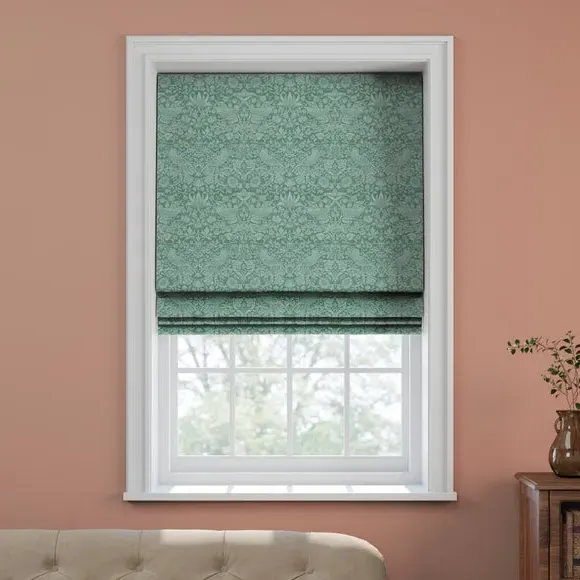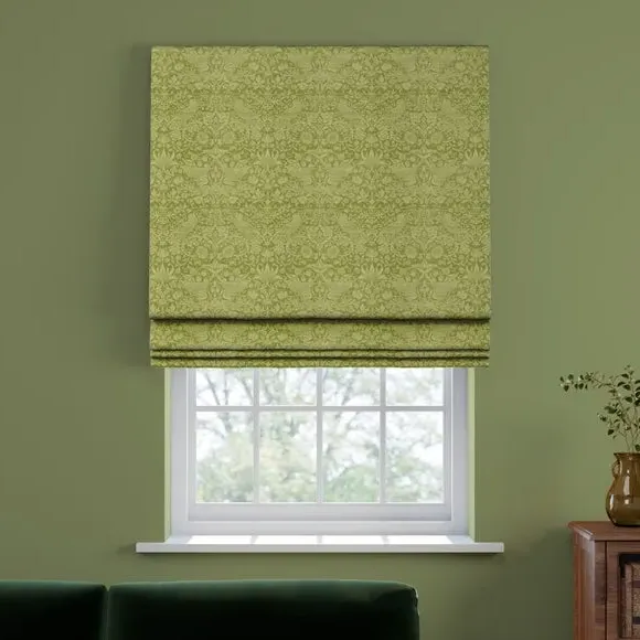 The Roman Blind provides bespoke sizing with its made-to-measure construction, showcasing the classic Strawberry Thief design in exclusive Apple colourway. Its cotton material offers natural beauty and durability, while the selection of three linings ensures optimal light control. The chain operation can be customized to left or right side, and the blind fits both inside and outside window recesses.