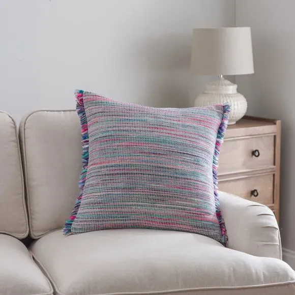 The square cushion features soft pastel tones with its charming fringe edge that brings gentle texture and visual appeal. Its cotton construction offers comfort and breathability, while the removable cover with zip closure allows for effortless cleaning. The handcrafted fringe detailing adds artisanal character to any seating arrangement.