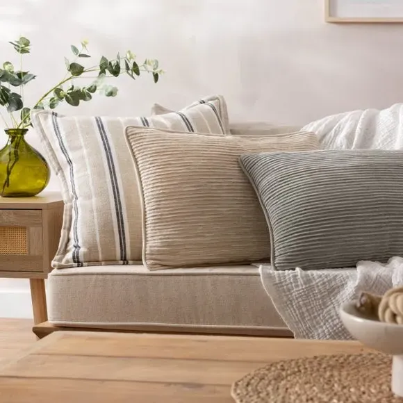 The cushion offers comfort with its textured ribbed design inspired by natural sand lines. Crafted from super-soft 100% cotton, it features a complementing cotton reverse and piped trim detailing. The hidden zip fastening provides easy access while maintaining clean lines, and the durable construction ensures lasting appeal.