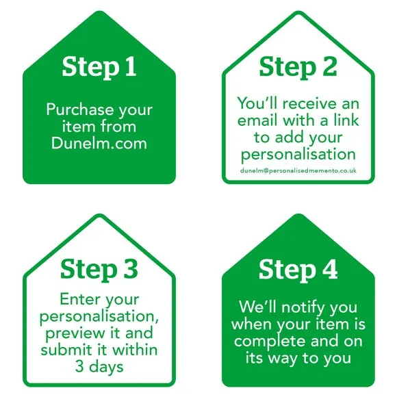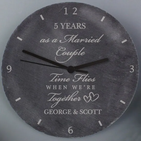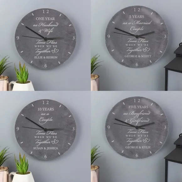* Please see below on how to personalise your clock* Perfect Anniversary gift* Personalize with 4 lines of text:* Line 1: Up to 15 characters (fixed upper case)* Line 2: Up to 15 characters (avoid block capitals)* Line 3: Up to 15 characters (avoid block capitals)* " Time Flies When We're Together" is fixed text* Add a message at the bottom, up to 20 characters (fixed upper case)* Each slate piece is unique with natural variations* Contains speckles of fools gold for a rustic feel* Requires 1 x AA battery (not included)* Numbered display This Personalised Anniversary Slate Clock is the perfect way to commemorate a special milestone. It's a thoughtful gift that combines personalisation with timeless design.**How to personalise your product:**1. Place your order2. You will receive an email from dunelm@personalisedmemento. co. uk within 1 hour to add your personalised message. If not received, please check your junk folder.3. Once received, follow the link within the email.4. Type your message into the fields on screen and click on the preview button to review the personalisation.5. Once checked and happy, click submit.6. Production of the order will commence.**Please note:*** The content on a personalised product will be produced exactly as you enter it, including spelling and capitalisation. Please ensure that all details, especially the personalised text, are correct before clicking submit.* Accents, special characters and emojis are not accepted.* Once the personalisation has been submitted, the order cannot be amended or cancelled.* If the personalisation is not submitted within 3 days, the order will be automatically cancelled.* We do not permit personalisation that infringes copyright laws, is indecent or offensive, or contains language deemed to be abusive, threatening, or defamatory. Full content rules can be viewed on the personalisation terms and conditions page. Orders that do not follow these rules will be refused. By ordering a personalised product, you are agreeing that your details (name and contact details, including address) and the details that you provide of any other party, such as the recipient of the personalised product, can be shared with our third party supplier who provides the personalisation service only for the purposes of completing the personalisation service and delivering the product to you or the recipient.