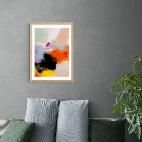 The framed print features vibrant watercolour artwork printed on 210gsm acid-free archival paper. Its giclee printing process maintains colour vibrancy over time, while the customizable frame options include black, white, and oak effect finishes. The abstract design combines colourful watercolours that add visual interest to any space, and the archival-quality paper ensures long-lasting durability.