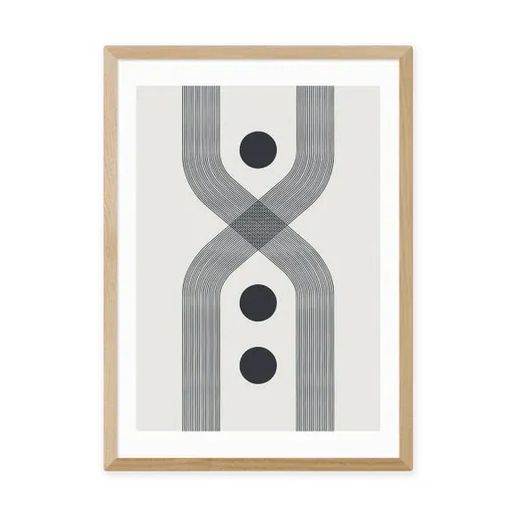 The abstract print features geometric lines and circles in a contemporary design. Printed on 210gsm acid-free archival paper using giclee printing process, it maintains vibrant colors over time. Available in multiple sizes from A4 to A1, with frame options in black, white, and oak effect finishes. The high-quality archival paper ensures long-lasting durability and color retention.