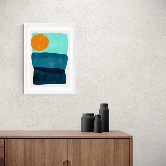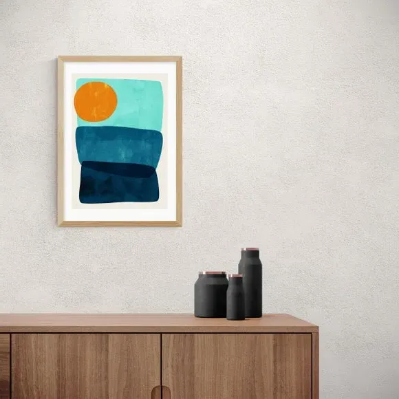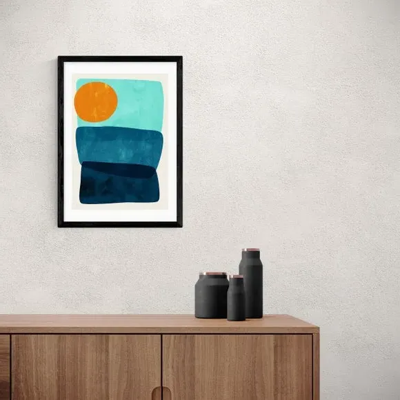 The abstract wall print features sunset-inspired tones with its giclee printing process on 210gsm acid-free archival paper. Its vibrant colors provide lasting visual appeal, while the archival quality ensures durability over time. The print offers customizable sizing options from A4 to A1, and frame choices include black, white, and oak effect finishes for versatile display.