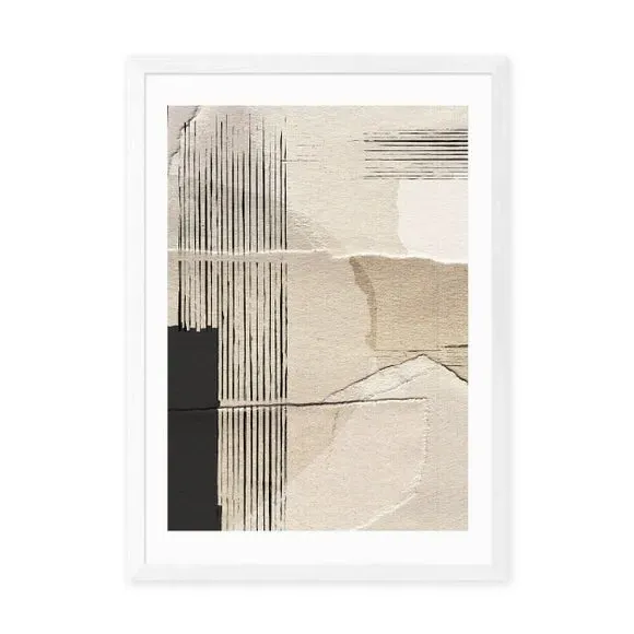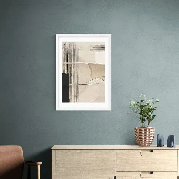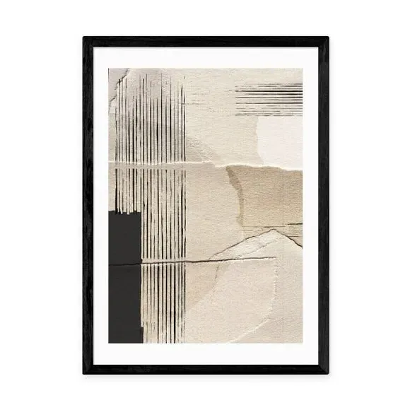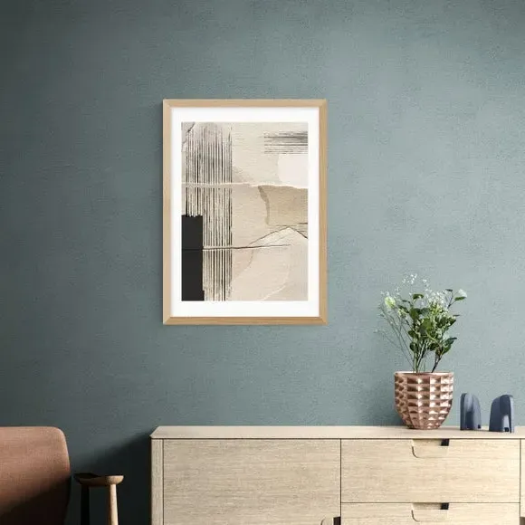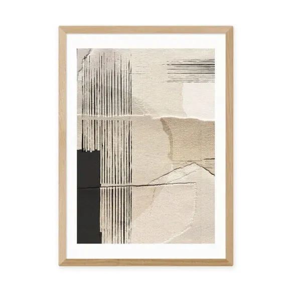 The abstract wall print offers contemporary style with its giclee printing process on 210gsm acid-free archival paper. Its natural tones provide versatile appeal, while the archival quality ensures long-lasting vibrancy. The print comes with multiple size options from A4 to A1, and frame choices include black, white, and oak effect finishes for customizable display.