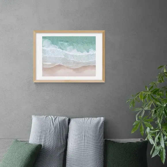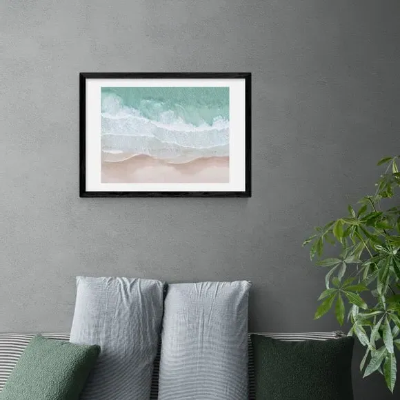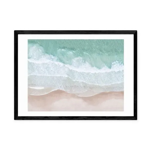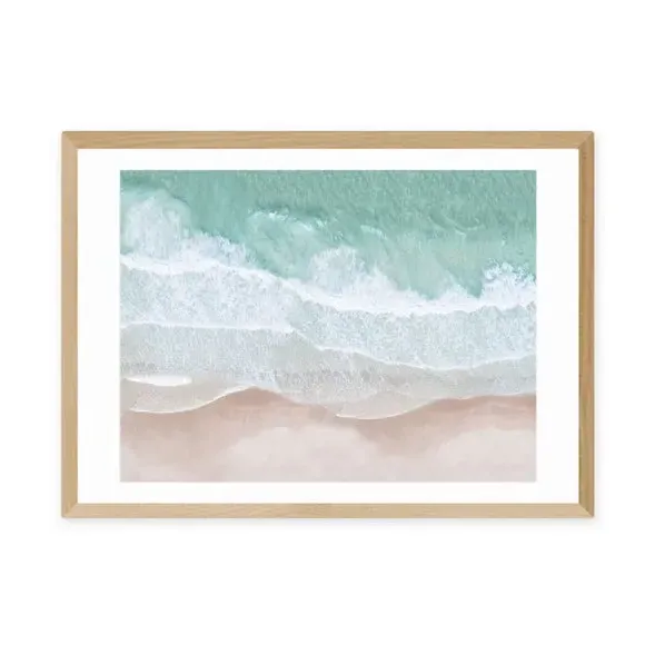 * Artwork by Sisi and Seb* Coastal theme* Landscape orientation* Printed on 210gsm acid-free archival paper* Available in A1, A2, A3 & A4 sizes* Frame options: black, white and oak wood effect* Available in unframed option Embrace costal vibes and aerial sea views with this stunning artwork by Sisi and Seb. Pulling through pink and blue colour tones in photographic style artwork, this print will add a sense of travel and adventure to any space. Made using a Giclee printing process to prevent fading, this print will stay vibrant for years to come and Each design is available in four print sizes and a variety of frame options, including unframed, so you can display your artwork however you wish.