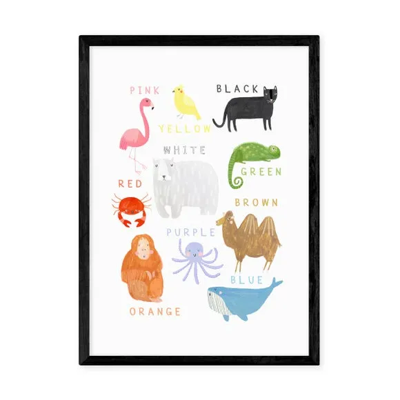 * Colourful animal print* Fade-resistant* Printed on 210gsm acid-free archival paper* Available in A1, A2, A3 & A4 size* Frame options: black, white and oak wood effect* Available in unframed option Ideal for a child's room or nursery, this colourful print features a range of friendly animals, with the names of their colours featured nearby. It's the perfect way to add a bright, decorative touch, whilst teaching children about colours. This print is available in a range of sizes, solid wood frames or unframed to suit your decor.