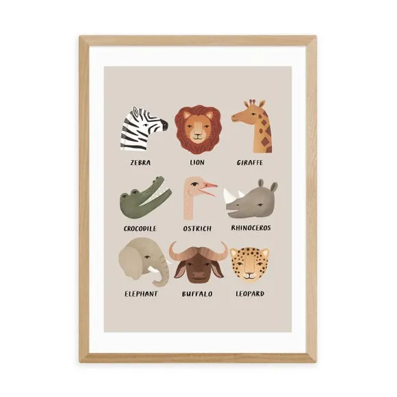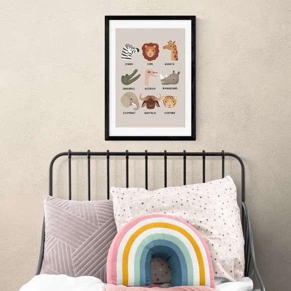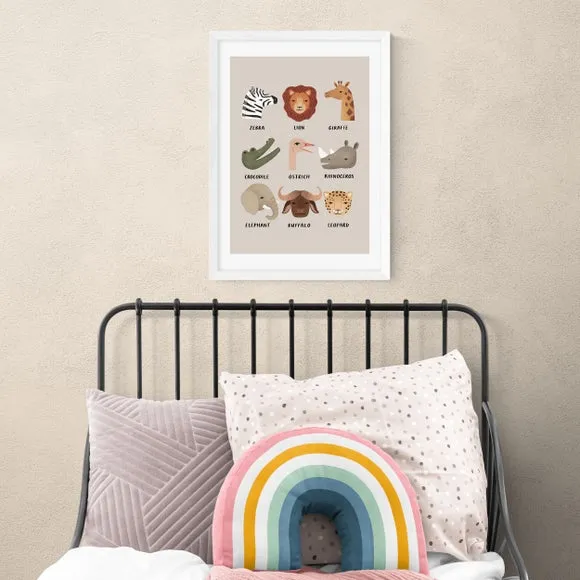 * Artwork by Kid of the Village* Available in A1, A2, A3 & A4 sizes* Obeche Wood Frames available in black, white and oak effect* You can buy the print unframed too!* Prints are made using the Giclee printing process, lasting up to 70 years from fading* Printed on 210gsm acid free archival paper with a digital white border This Animal Safari print is a vibrant and educational design, perfect for helping little ones learn the names of animals. Its colourful depiction is ideal for brightening up a nursery or children's room. You are able to customise the size and frame for this print! Choose from a variety of frame options and then pick your size. This way you can find the best design to suit your home interior.