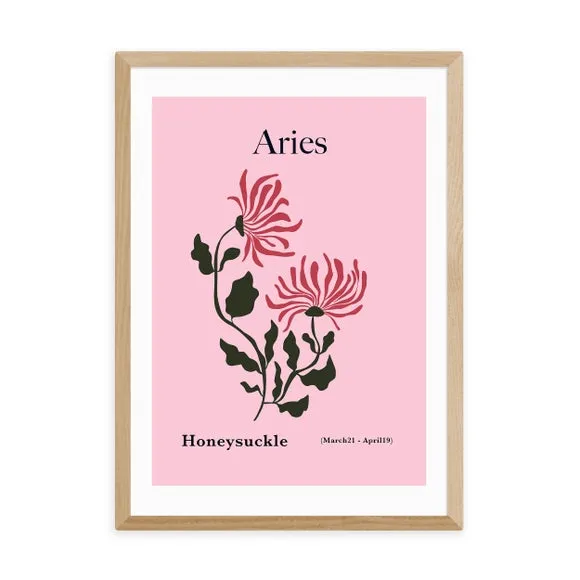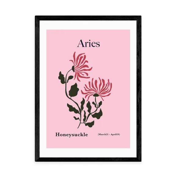 * Aries Inspired* Artwork by Miho Art Studio* Printed on 210GSM Acid-Free Archival Paper* Available in A1, A2, A3, & A4 Sizes* Frame Options: Black, White, Oak Effect, & Unframed Celebrate the Aries star sign with this stunning pink-themed print of honeysuckle. Customise the look by selecting your preferred frame and size. Printed on 210gsm acid-free archival paper, it features a digital white border. The giclee printing process ensures your print stays vivid for up to 70 years. Please Note: For every print sold, a percentage of profit is donated to Cool Earth - a charity combating deforestation in the rainforest.