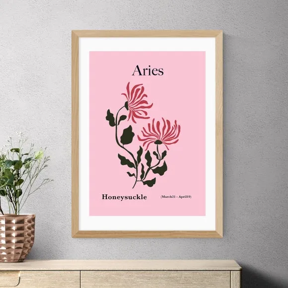 The Aries art print features a stunning honeysuckle design in pink tones, celebrating the zodiac sign with botanical elegance. Printed on 210GSM acid-free archival paper, it offers long-lasting quality with a digital white border for clean presentation. The giclee printing process ensures vibrant colors that remain vivid for up to 70 years, while multiple frame options allow customization to suit any space.