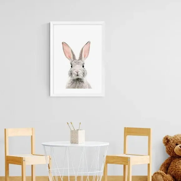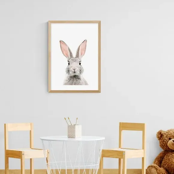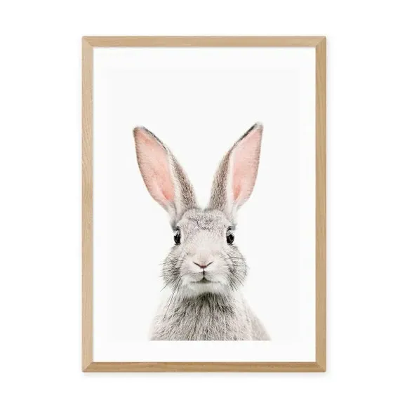 The Baby Bunny Print features charming artwork with portrait orientation, printed on 210gsm acid-free archival paper. Its Giclee printing process provides vibrant colors while preventing fading over years. The print comes with multiple frame options including black, white, and oak wood effect finishes, or can be displayed unframed. Available in A1, A2, A3, and A4 sizes to suit various display preferences.