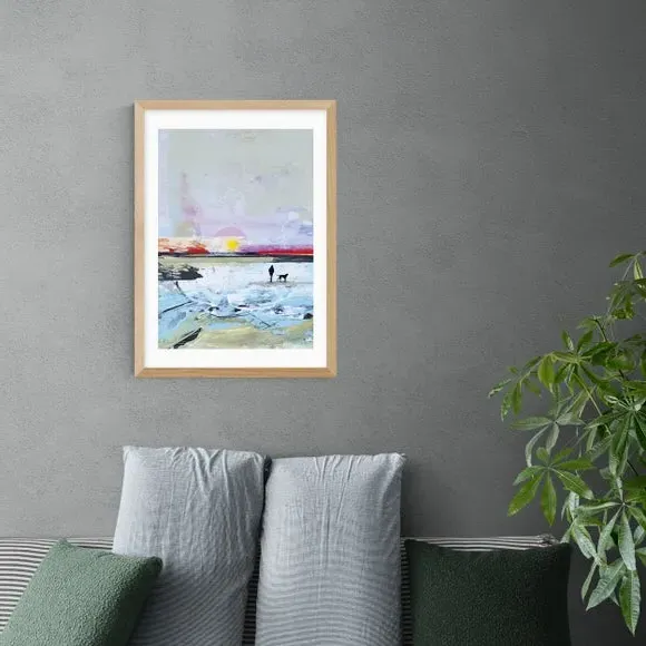 The Beach Walk Art Print features an abstract coastal design with vibrant multicolor tones that bring visual interest to any wall. Printed on 210gsm acid-free archival paper using Giclee printing process, it maintains color vibrancy and prevents fading over time. The portrait orientation suits various display arrangements, while multiple size options from A4 to A1 accommodate different spaces. Frame choices include black, white, and oak wood effect finishes, with an unframed option available for custom display preferences.