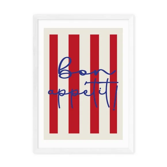 The Bon Appetit print features vibrant red stripes with Giclee printing technology that resists fading for up to 70 years. Printed on 210gsm acid-free archival paper, it includes a digital white border for a polished finish. The artwork offers multiple size options from A4 to A1, while optional Obeche wood frames come in black, white, and oak effect finishes. Frame options provide versatile display choices to complement various interior styles.