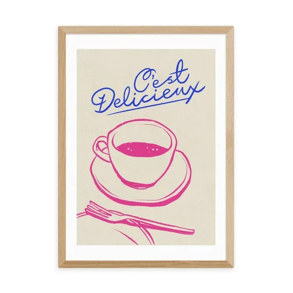 The C'est Delicieux print features vintage-inspired design with elegant script and a pastel pink teacup illustration. Its Giclee printing process provides fade resistance for up to 70 years, while the 210gsm acid-free archival paper ensures long-lasting quality. The digital white border adds a clean finish, and the customizable sizing options suit various display preferences.