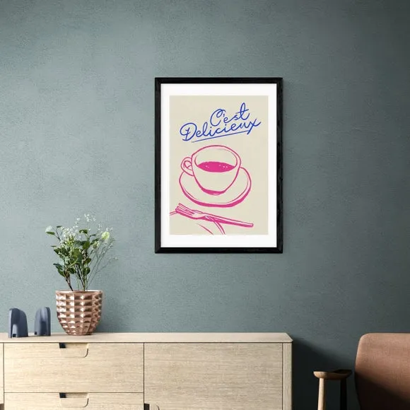 * Artwork by Simply Extra Jordanary* Available in A1, A2, A3 & A4 sizes* Obeche Wood Frames available in black, white and oak effect* You can buy the print unframed too!* Prints are made using the Giclee printing process, lasting up to 70 years from fading* Printed on 210gsm acid free archival paper with a digital white border Add a dash of culinary flair to your home with this vibrant C'est Delicieux print by Simply Extra Jordanary, ideal for creating an inviting and appetising atmosphere. This print showcases a vintage-inspired design with elegant script and a pastel pink teacup illustration, creating a nostalgic and delightful aesthetic. You are able to customise the size and frame for this print! Choose from a variety of frame options and then pick your size. This way you can find the best design to suit your home interior.