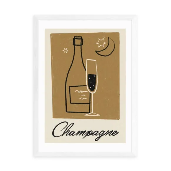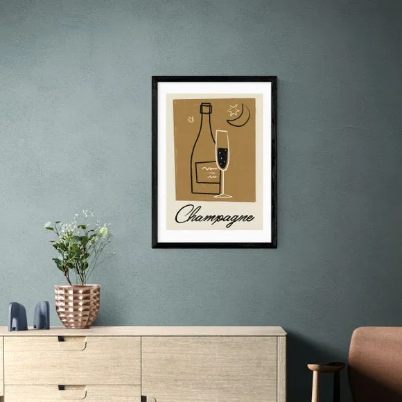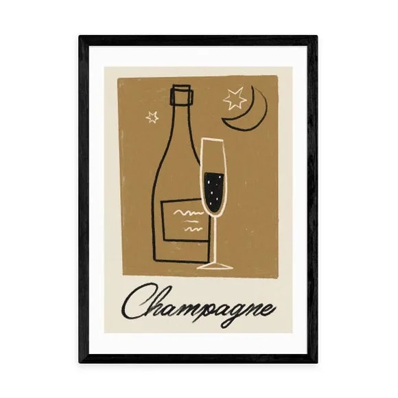 * Artwork by Telegramme Paper Co* Available in A1, A2, A3 & A4 sizes* Obeche Wood Frames available in black, white and oak effect* You can buy the print unframed too!* Prints are made using the Giclee printing process, lasting up to 70 years from fading* Printed on 210gsm acid free archival paper with a digital white border Add a touch of vintage glamour to your home with this stylish Champagne print by Telegramme Paper Co, perfect for creating a sophisticated and festive ambience. Featuring a retro-inspired design with muted earthy tones and a vintage style illustration of a champagne bottle, this print adds a touch of classic glamour to your decor. You are able to customise the size and frame for this print! Choose from a variety of frame options and then pick your size. This way you can find the best design to suit your home interior.