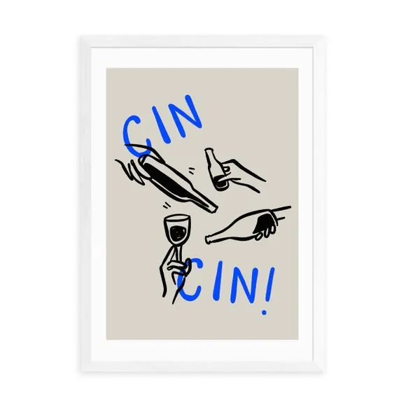 The Cin Cin print features bold minimalist typography with bright blue and black lettering against a neutral background. Made using the Giclee printing process on 210gsm acid-free archival paper, it offers fade resistance for up to 70 years. The digital white border adds a clean finish, while multiple size options from A4 to A1 accommodate various spaces. Frame options include obeche wood in black, white, and oak effect finishes.