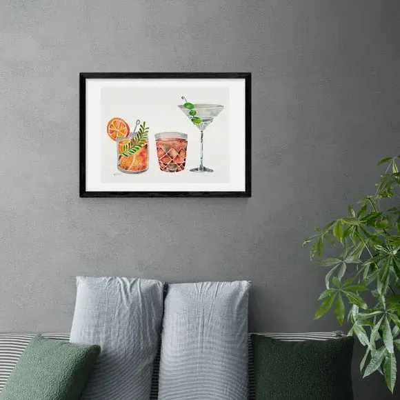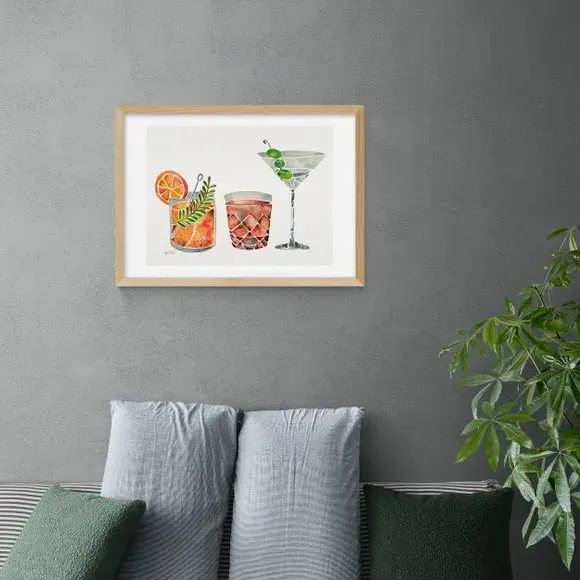 * Artwork by Cat Coquilliette* Relaxed food and drink theme* Landscape orientation* Printed on 210gsm acid-free archival paper* Available in A1, A2, A3 & A4 size* Frame options: black, white and oak wood effect* Available in unframed option Raise a glass to life’s little achievements and enjoy this bright and bold artwork by Cat Coquilliette. Made using a Giclee printing process to prevent fading, this colourful illustration featuring a relaxed food and drink theme is perfect for a kitchen or living room area and will stay vibrant for years to come. Each design is available in four print sizes and a variety of frame options, including unframed, so you can display your artwork however you wish.