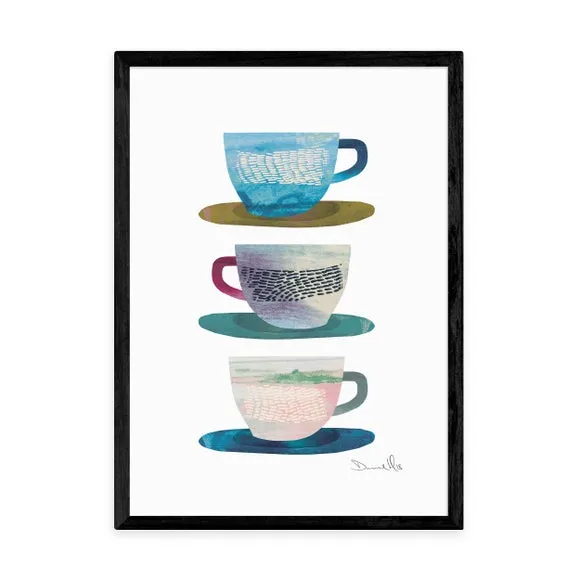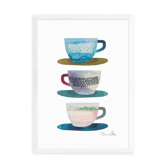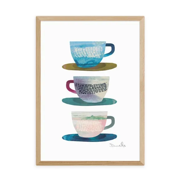 The Coffee Cups Print features food and drink artwork by Dan Hobday, printed on 210gsm acid-free archival paper. Its giclee printing process ensures vibrant colors that last for years, while the archival quality paper provides durability. The print comes in multiple size options from A4 to A1, with frame choices including black, white, and oak effect finishes.