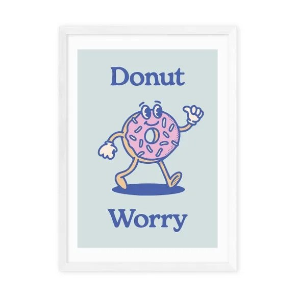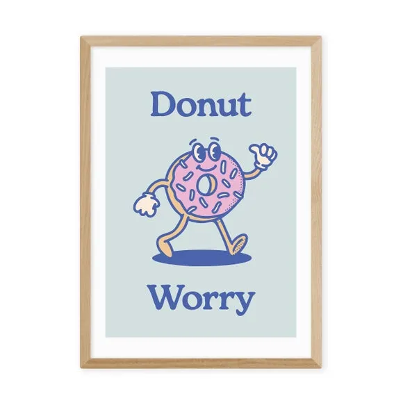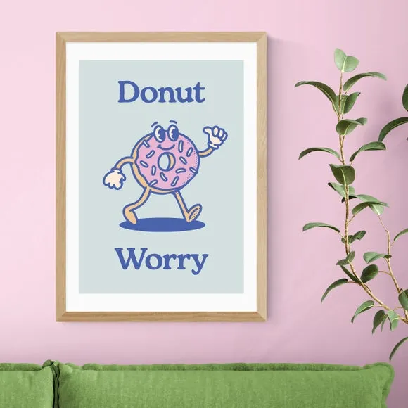 The wall print features a friendly donut character with playful 'Donut Worry' wordplay that brings charm to any space. Printed on 210gsm acid-free archival paper, it offers lasting quality and vibrant color retention. Available in multiple sizes from A4 to A1, with frame options in black, white, or oak wood effect finishes.
