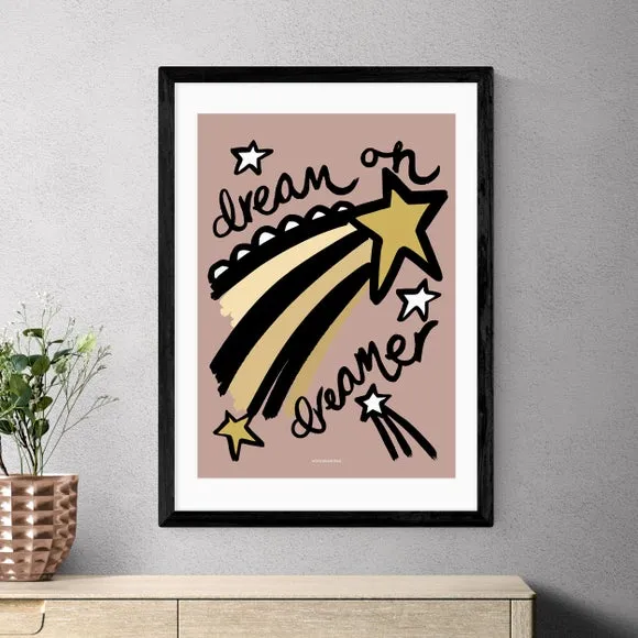 The Dream Pink art print features vibrant shooting stars with bold multicolor tones. Printed on 210GSM acid-free archival paper, it includes a digital white border for added elegance. The giclee printing process ensures colors remain bright and vivid for up to 70 years, while multiple frame options allow customization to suit any space.