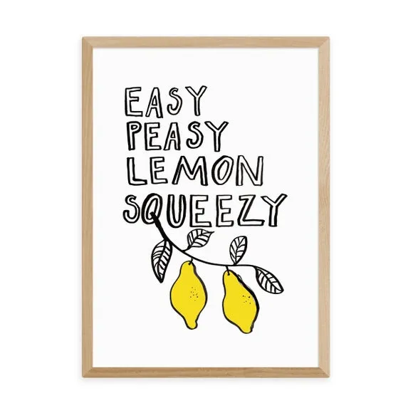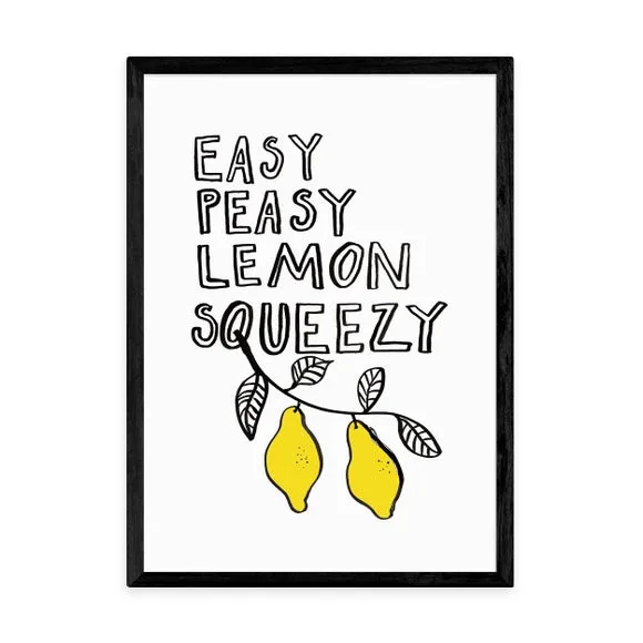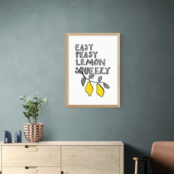 * Artwork by Keren Parmley* Available in A1, A2, A3 & A4 sizes* Obeche Wood Frames available in black, white and oak effect* You can buy the print unframed too!* Prints are made using the Giclee printing process, lasting up to 70 years from fading* Printed on 210gsm acid free archival paper with a digital white border Add a touch of minimalist charm to your home with this delightful Easy Peasy Lemon print by Keren Parmley, perfect for creating a light and cheerful ambience. You are able to customise the size and frame for this print! Choose from a variety of frame options and then pick your size. This way you can find the best design to suit your home interior.