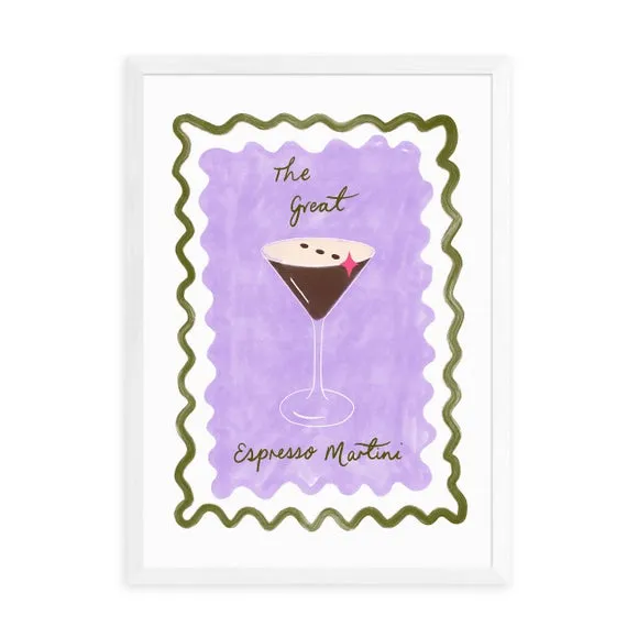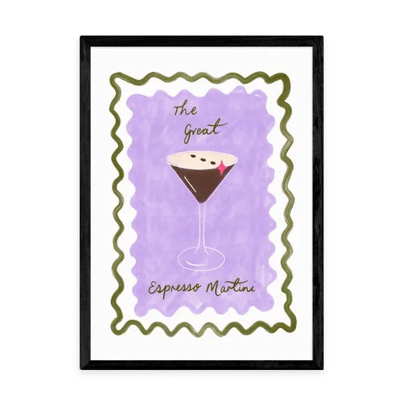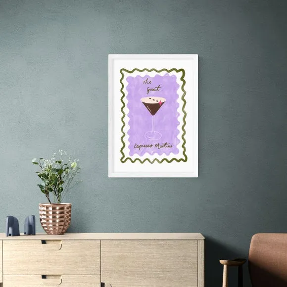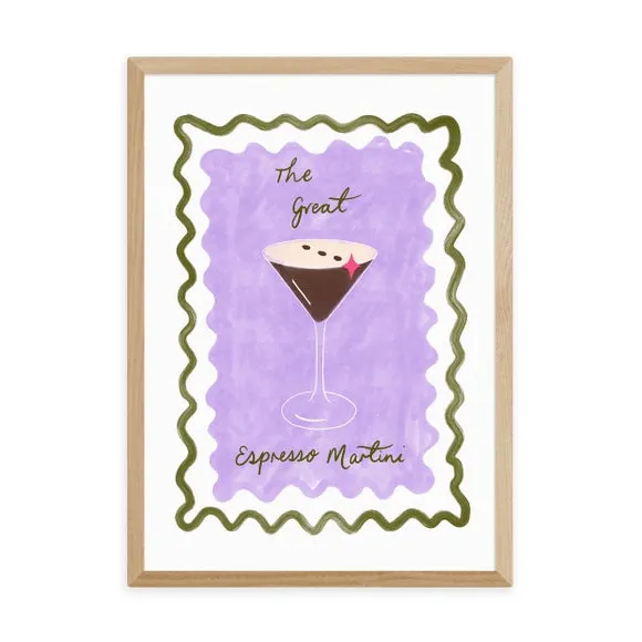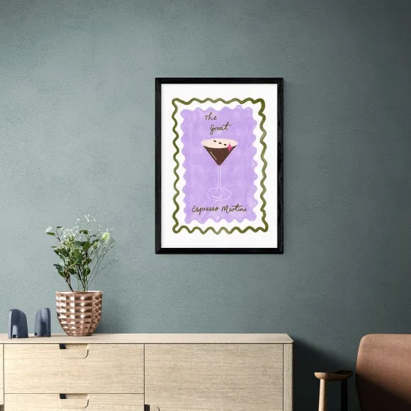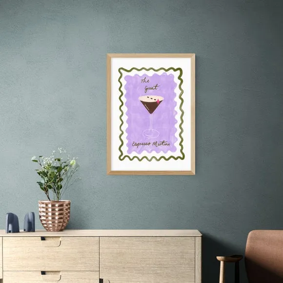 * Artwork by Emmy Lupin Studio* Available in A1, A2, A3 & A4 sizes* Obeche Wood Frames available in black, white and oak effect* You can buy the print unframed too!* Prints are made using the Giclee printing process, lasting up to 70 years from fading* Printed on 210gsm acid free archival paper with a digital white border Step into the world of " Espresso" by Emmy Lupin Studio, where coffee meets cocktails in a vibrant display of colour. Perfect for the kitchen or bar area, this print adds a lively touch to any space. You are able to customise the size and frame for this print! Choose from a variety of frame options and then pick your size. This way you can find the best design to suit your home interior.