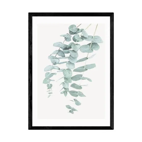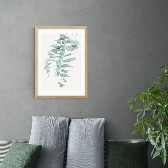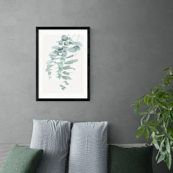 The Eucalyptus 2 wall print features botanical artwork with floral styling, printed on 210gsm acid-free archival paper. Its giclee printing process provides vibrant colors that resist fading over time, while the archival-quality paper ensures long-lasting durability. The print comes with customizable framing options including black, white, and oak effect finishes, and is available in multiple sizes from A4 to A1.