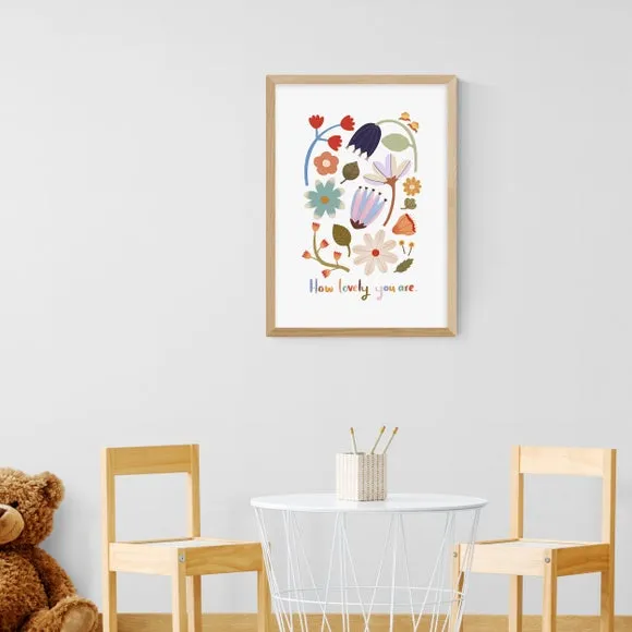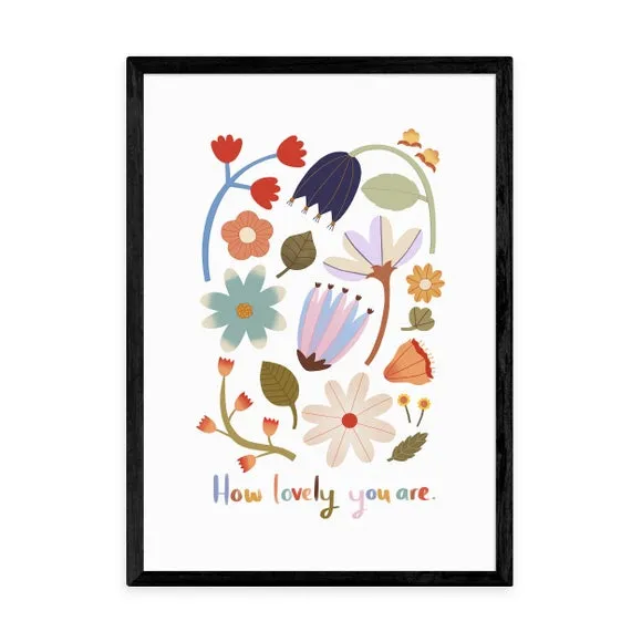 * Artwork by Kid of the Village* Uplifting floral design* Portrait orientation* Printed on 210gsm acid-free archival paper* Available in A1, A2, A3 & A4 sizes* Frame options: black, white and oak wood effect* Available in an unframed option Fill your walls with this blooming beautiful print by Kid of the Village featuring a range of delightful florals in an illustrative style and a positive “how lovely you are” statement. This print is made to last as it uses a Giclee printing process to stay vibrant and prevent fading over years. Each design is available in four print sizes and a variety of frame options, including unframed, so you can display your artwork however you wish.