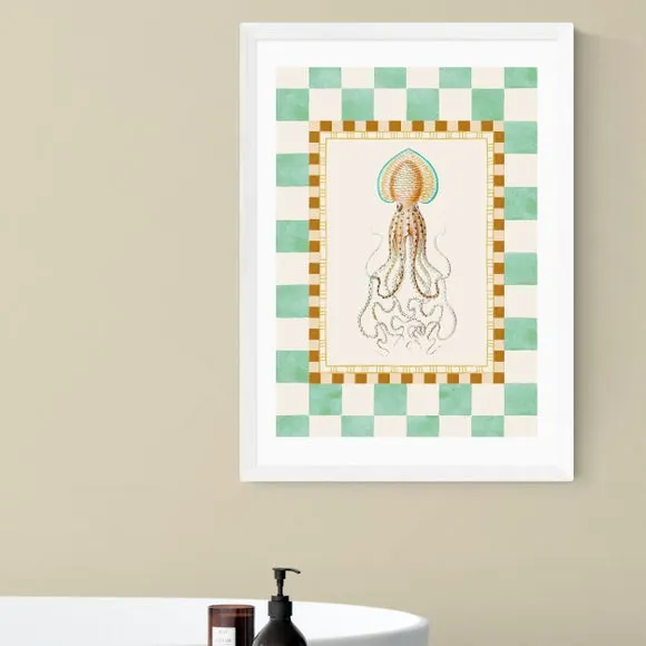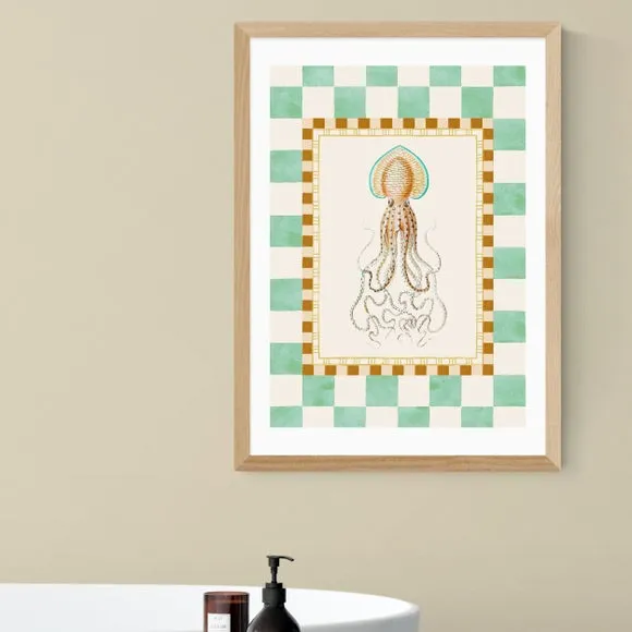 The wall print features vibrant underwater charm with its playful squid design and bold colours. Printed using giclee technology on 210gsm acid-free archival paper, it provides fade resistance lasting up to 70 years. The nature-inspired artwork combines quirky appeal with quality construction, while frame options in black, white, and oak effect complement various decor styles.