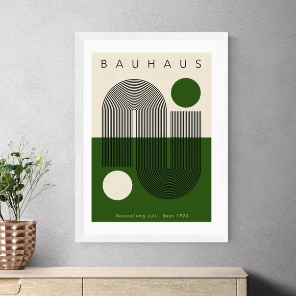 * Artwork by Luxe Poster Co* Available in A1, A2, A3 & A4 sizes* Obeche Wood Frames available in black, white and oak effect* You can buy the print unframed too!* Prints are made using the Giclee printing process, lasting up to 70 years from fading* Printed on 210gsm acid free archival paper with a digital white border Inspired by Bauhaus design principles, this beautiful poster from the Luxe Poster Co is ideal for infusing your home with a sense of balance. Available in a chic green colourway, this print is perfect for Mid Century styling. You are able to customise the size and frame for this print! Choose from a variety of frame options and then pick your size. This way you can find the best design to suit your home interior. Please Note: For every print sold, a percentage of profit is donated to Cool Ear–h - a charity combating deforestation in the rainforest.