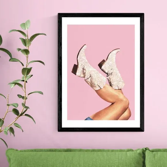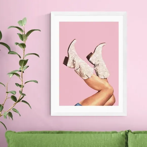The wall print features glamorous glitter boots on a vibrant pink background, printed on 210gsm acid-free archival paper. Its fade-resistant printing process maintains bright colors over time, while the archival quality ensures long-lasting durability. The design adds character and color to any wall space, with frame options available in black, white, and oak wood effect finishes.