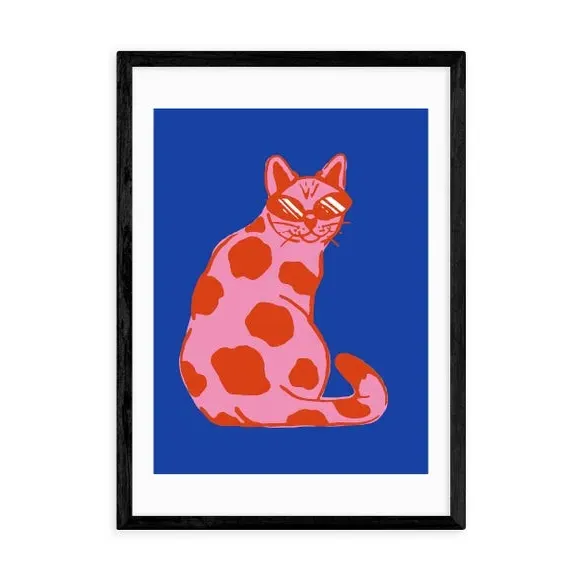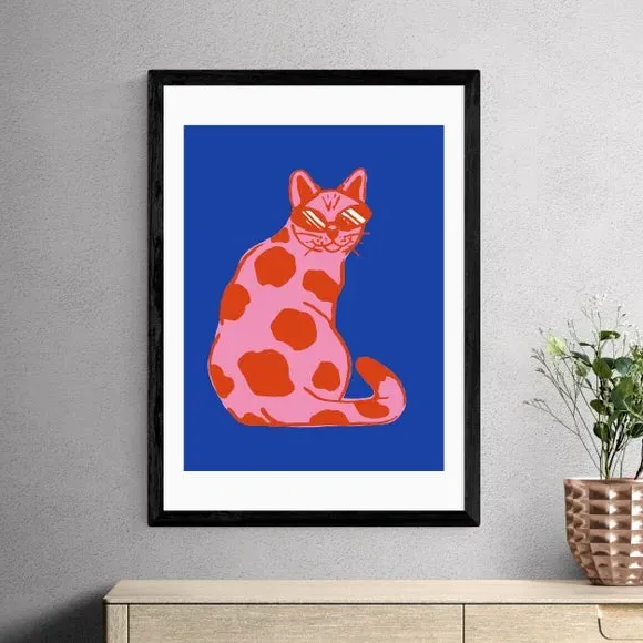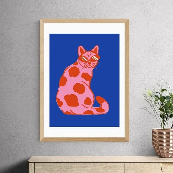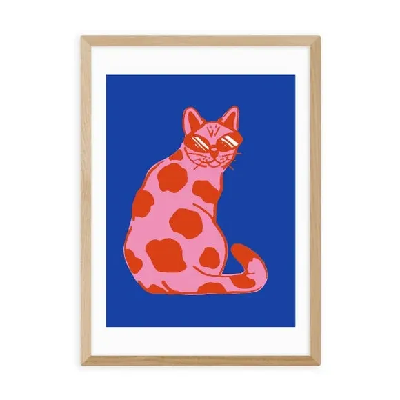 * High contrast, clashing colour* Modern artwork* Cat design* Available in A1, A2, A3 & A4 sizes* Choice of black, white and oak effect Obeche wood frames* You can buy the print unframed too!* Giclee printed on 210gsm acid free archival paper This eye-catching print features clashing colours of blue, pink and red for an impactful statement. The groovy cat complete with sunglasses brings a playful and fun aspect to this décor piece, great for a bold design choice in your space. You can customise the size and frame for this print! Choose from a variety of frame options and then pick your size. This way you can find the best design to suit your home interior. Each piece of artwork has gone through a giclee printing process which will help the print stay vibrant for years to come, keeping your home looking fresh. For every print sold, a percentage of profit is donated to Cool Earth, a charity combating deforestation in the rainforest.
