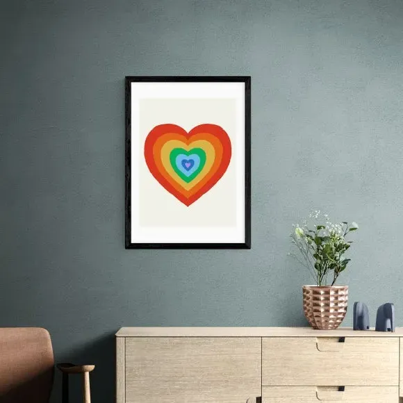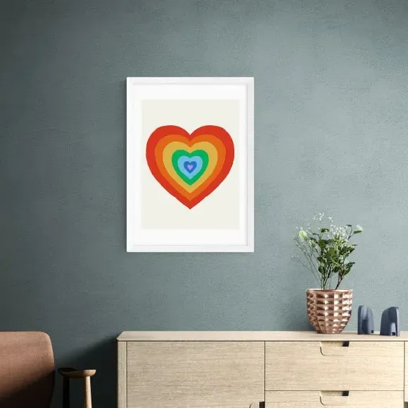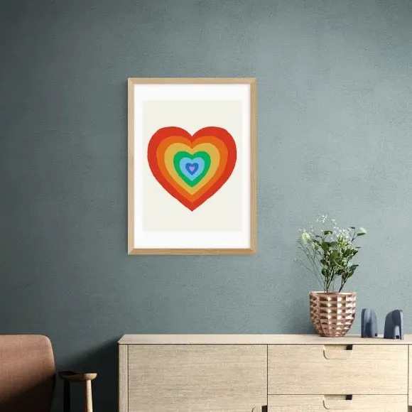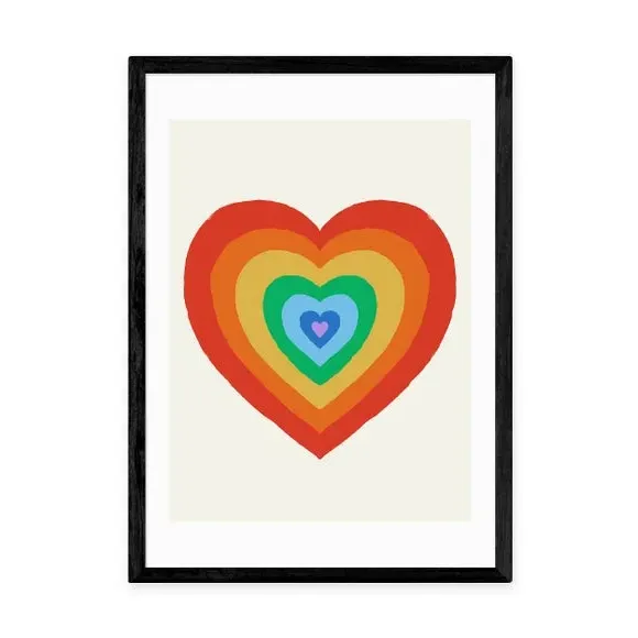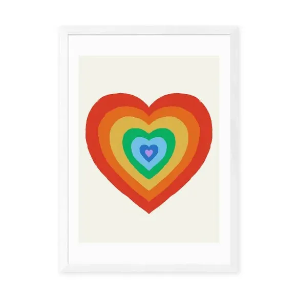 * Artwork by Tartagain* Available in A1, A2, A3 & A4 sizes* Obeche Wood Frames available in black, white and oak effect* You can buy the print unframed too!* Prints are made using the Giclee printing process, lasting up to 70 years from fading* Printed on 210gsm acid free archival paper with a digital white border Celebrate pride and self-love with the cute rainbow heart print by Tartagain. This vibrant piece is the perfect statement for your living room or bedroom, spreading a message of love and acceptance. You are able to customise the size and frame for this print! Choose from a variety of frame options and then pick your size. This way you can find the best design to suit your home interior.