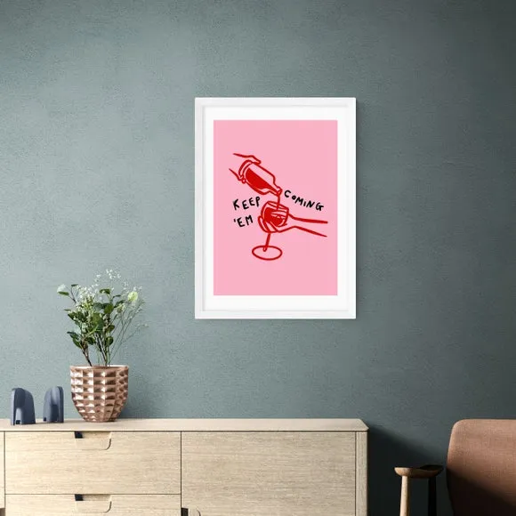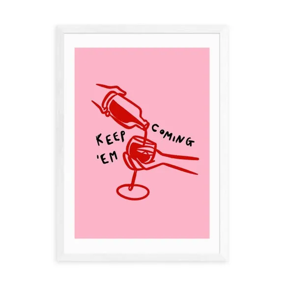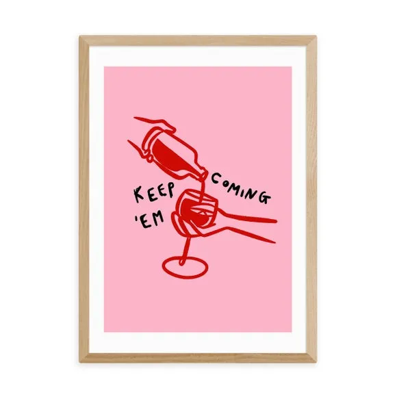 * Artwork by Simply Extra Jordanary* Available in A1, A2, A3 & A4 sizes* Obeche Wood Frames available in black, white and oak effect* You can buy the print unframed too!* Prints are made using the Giclee printing process, lasting up to 70 years from fading* Printed on 210gsm acid free archival paper with a digital white border Elevate your bar area with this bold Keep Em Coming print by Simply Extra Jordanary, capturing the fun and excitement of a lively gathering. This print presents a bold, graphic style with vivid red and white colours and a fun, energetic illustration of pouring drinks, ideal for a lively bar area. You are able to customise the size and frame for this print! Choose from a variety of frame options and then pick your size. This way you can find the best design to suit your home interior.