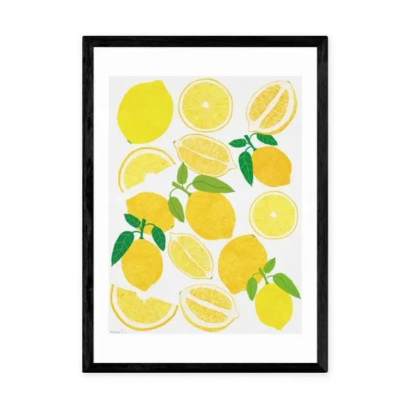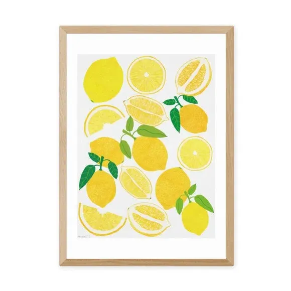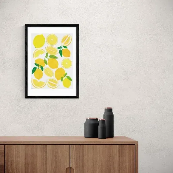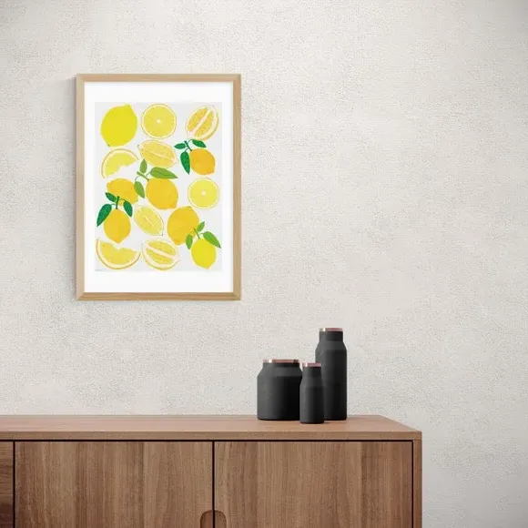 * Artwork by Leanne Simpson* Uplifting citrus fruit theme* Portrait orientation* Printed on 210gsm acid-free archival paper* Available in A1, A2, A3 & A4 size* Frame options: black, white and oak wood effect* Available in unframed option When life gives you lemons, display them on your wall! Bringing vibrant yellow hues and uplifting lemon shapes, this artwork by Leanne Simpson is perfect to display in your kitchen or conservatory. Made to last using a Giclee printing process to prevent fading over years, this citrus print will stay vibrant for years to come. Each design is available in four print sizes and a variety of frame options, including unframed, so you can display your artwork however you wish.