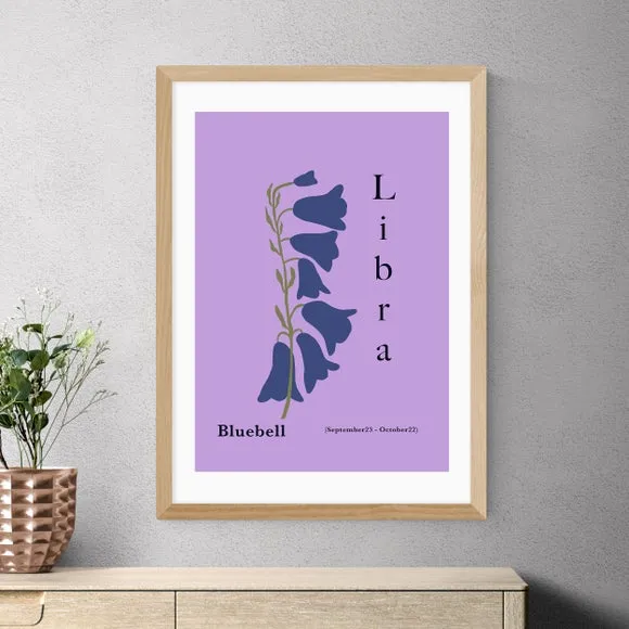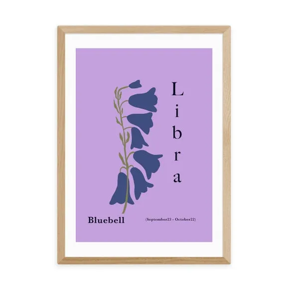 The Libra art print features beautiful purple bluebells inspired by the zodiac constellation. Printed on 210GSM acid-free archival paper with giclee technology, it maintains vibrant colors and fade resistance for up to 70 years. The digital white border adds a clean finish, while multiple frame options including black, white, and oak effect complement any decor. Available in A1, A2, A3, and A4 sizes to suit different spaces.