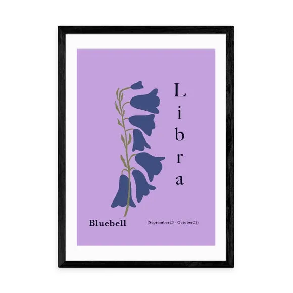* Libra Inspired* Artwork by Miho Art Studio* Printed on 210GSM Acid-Free Archival Paper* Available in A1, A2, A3, & A4 Sizes* Frame Options: Black, White, Oak Effect, & Unframed Enhance your space with this beautiful purple print of bluebells, inspired by the Libra star sign. Choose from a variety of frames and sizes for the perfect fit. Printed on 210gsm acid-free archival paper, it features a digital white border. Thanks to giclee printing, your print will stay vibrant and fade-free for up to 70 years. Please Note: For every print sold, a percentage of profit is donated to Cool Earth - a charity combating deforestation in the rainforest.