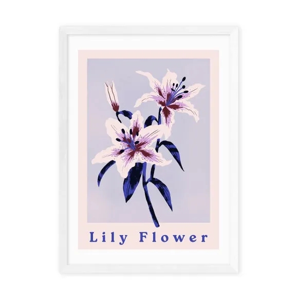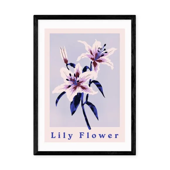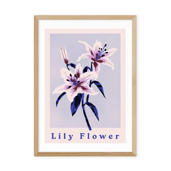 The Lily Flower Art Print combines calming purple tones with delicate floral imagery. Printed using fade-resistant technology on 210gsm acid-free archival paper, it provides lasting quality and color retention. The print offers versatile display options with solid Obeche wood frames in black, white, and oak wood effect, or can be purchased unframed.