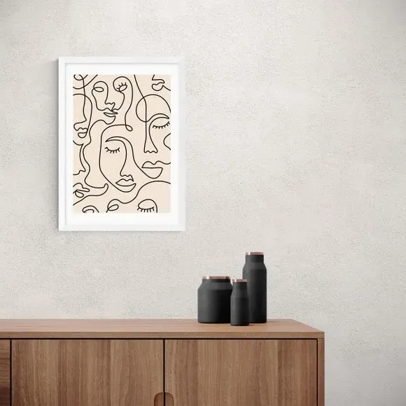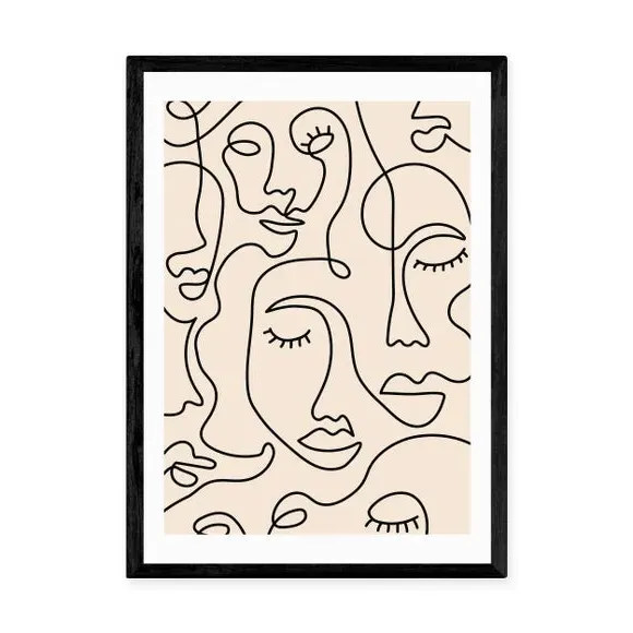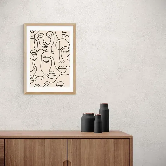 The wall print features minimalist figurative line drawing with fluid shapes and intertwining lines creating face outlines. Printed on 210gsm acid-free archival paper using Giclee printing process to prevent fading and maintain vibrant colors over time. The portrait orientation design offers versatile display options with multiple size choices from A4 to A1. Frame options include black, white, and oak wood effect finishes, with unframed option also available.