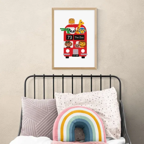 * Artwork by Dicky Bird* Fun animal design* Portrait orientation* Printed on 210gsm acid-free archival paper* Available in A1, A2, A3 & A4 size* Frame options: black, white and oak wood effect* Available in unframed option Complete a playroom, nursery or bedroom with the bright primary colours and simple bold graphic design of this artwork by Dicky Bird. Made using a Giclee printing process to prevent fading, this children’s print features a London bus with adorable cartoon animals and will stay vibrant for years to come. Each design is available in four print sizes and a variety of frame options, including unframed, so you can display your artwork however you wish.