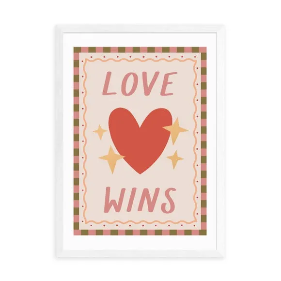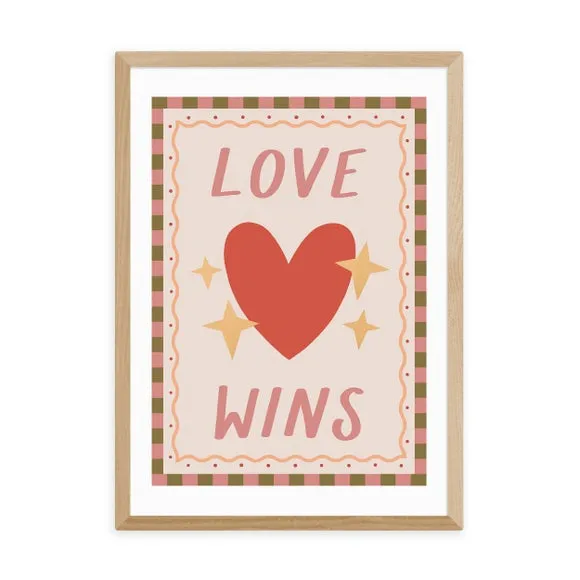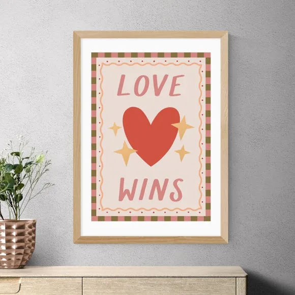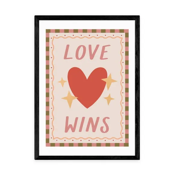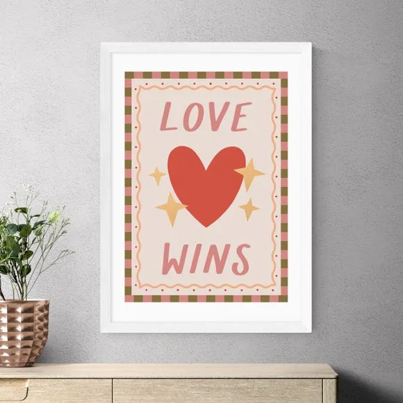 The Love Wins print features a vibrant heart design with pink and red tones on 210GSM acid-free archival paper. Its giclee printing process provides fade resistance for up to 70 years, while the digital white border adds a clean finish. The archival quality paper ensures long-lasting durability, and multiple frame options allow customization to suit any space.