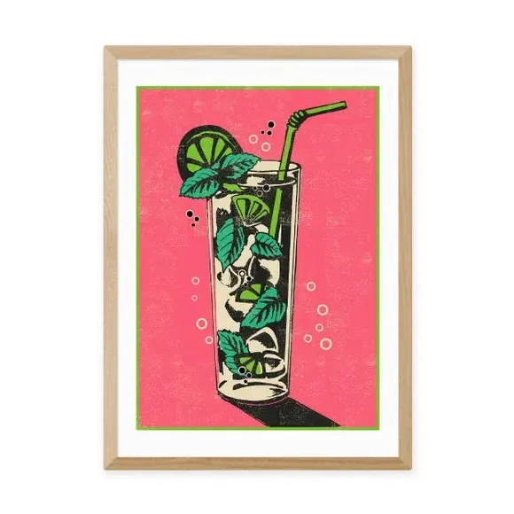 The Mojito print features vibrant pink tones with a retro-style design that brings refreshing summer vibes to your space. Created using the Giclee printing process, it offers fade resistance lasting up to 70 years while printed on 210gsm acid-free archival paper. The artwork includes a digital white border and comes with multiple size options from A4 to A1. Frame options include obeche wood in black, white, and oak effect finishes, or you can purchase the print unframed.