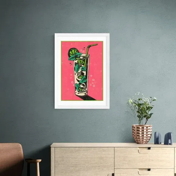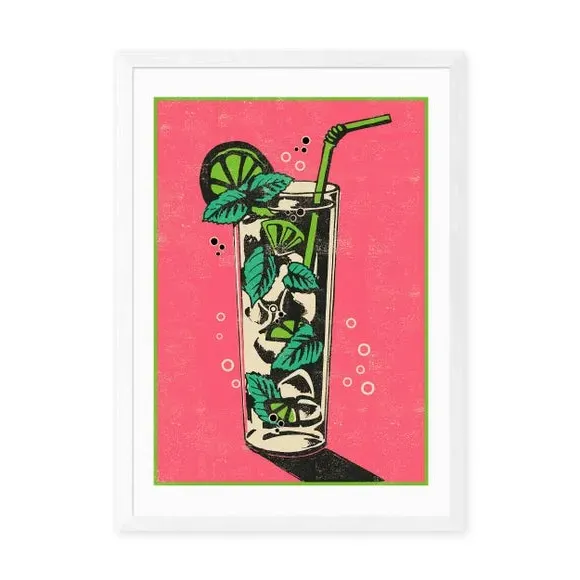 * Artwork by Jil White* Available in A1, A2, A3 & A4 sizes* Obeche Wood Frames available in black, white and oak effect* You can buy the print unframed too!* Prints are made using the Giclee printing process, lasting up to 70 years from fading* Printed on 210gsm acid free archival paper with a digital white border Capture the essence of summer with this refreshing Mojito print by Jil White. It's vibrant colour scheme and retro style design would bring a touch of class to any kitchen, dining space or bar. You are able to customise the size and frame for this print! Choose from a variety of frame options and then pick your size. This way you can find the best design to suit your home interior.