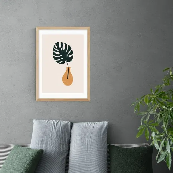 The Monstera Vase Print features botanical artwork with floral styling, printed on 210gsm acid-free archival paper. Its giclee printing process provides vibrant colors that maintain their quality over time, while the archival paper construction ensures long-lasting durability. The print offers customizable sizing options from A4 to A1, and frame choices include black, white, and oak effect finishes.